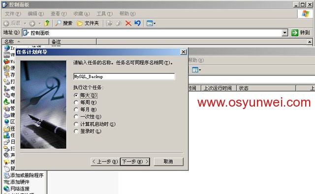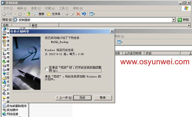 切换到日程安排来选项设置,还可以打开高级来设置每隔几分钟运行一次MySQL_Backup.bat这个脚本