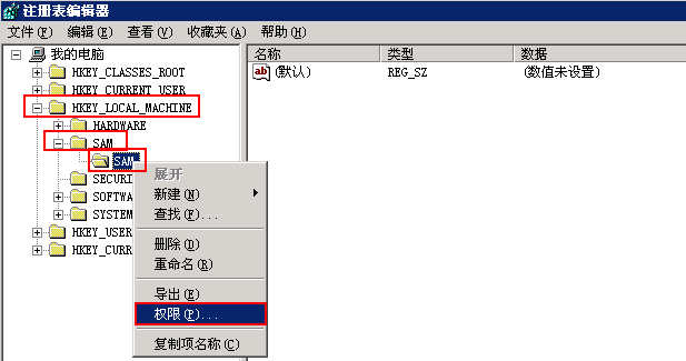 在注册表中对系统账户的键值进行操作,需要到“HKEY_LOCAL_MACHINE\SAM\SAM”处进行修改,但是当我们来到该处时,会发现无法展开该处所在的键值。这是因为系统默认对系统管理员给予“写入D AC”和“读取控制”权限,没有给予修改权限,因此我们没有办法对“SAM”项下的键值进行查看和修改。不过我们可以借助系统中另一个“注册表编辑器”给管理员赋予修改权限。