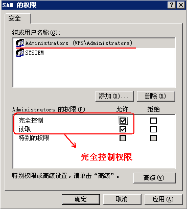 点击“开始”→“运行”,输入“regedt32.exe”后回车,随后会弹出另一个“注册表编辑器”,和我们平时使用的“注册表编辑器”不同的是它可以修改系统账户操作注册表时的权限(为便于理解,以下简称regedt32.exe)。在regedt32.exe中来到“HKEY_LOCAL_MACHINE\SAM\SAM”处,点击“安全”菜单→“权限”,在弹出的“SAM的权限”编辑窗口中选中“administrators”账户,在下方的权限设置处勾选“完全控制”,完成后点击“确定”即可。然后我们切换回“注册表编辑器”,可以发现“HKEY_LOCAL_MACHINE\SAM\SAM”下面的键值都可以展开了。
