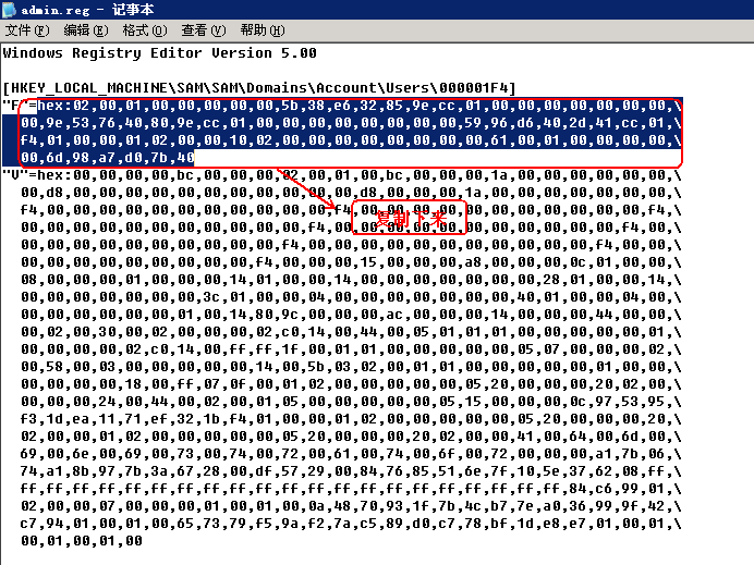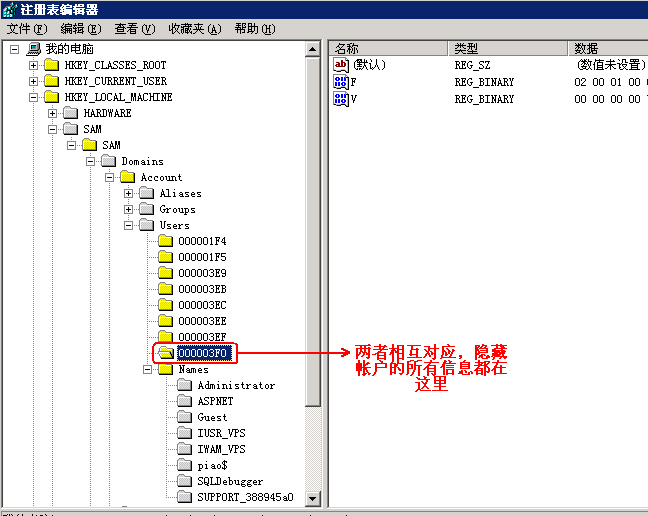 成功得到注册表操作权限后,我们就可以正式开始隐藏账户的制作了。来到注册表编辑器的“HKEY_LOCAL_MACHINE\SAM\SAM\Domains\Account\Users\Names”处,当前系统中所有存在的账户都会在这里显示,当然包括我们的隐藏账户。点击我们的隐藏账户“piao$”,在右边显示的键值中的“类型”一项显示为0x3f0,向上来到“HKEY_LOCAL_MACHINE\SAM\SAM\Domains\Account\Users\”处,可以找到“000003f0”这一项,这两者是相互对应的,隐藏账户“piao$”的所有信息都在“000003f0”这一项中。同样的,我们可以找到“administrator”账户所对应的项为“000001F4”。