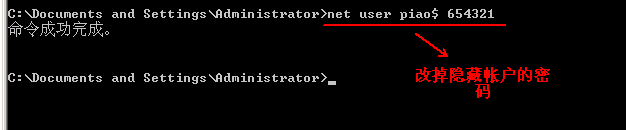 得知隐藏账户的名称后就好办了,但是我们仍然不能删除这个隐藏账户,因为我们没有权限。但是我们可以在“命令提示符”中输入“net user 隐藏账户名称 654321”更改这个隐藏账户的密码。这样这个隐藏账户就会失效,黑客无法再用这个隐藏账户登陆。