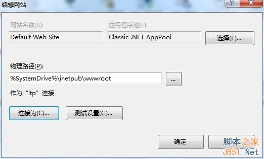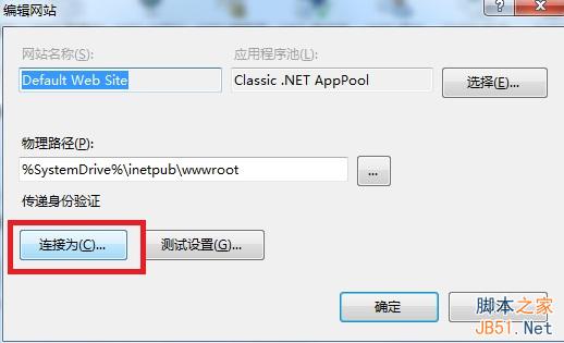 3、选中默认网站,点击右侧的基本设置,点击“连接为”,选择“特定用户”,点击设置,输入系统用户名密码。这里必须用操作系统的登录名和密码,不然无权访问硬盘分区。