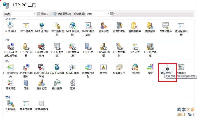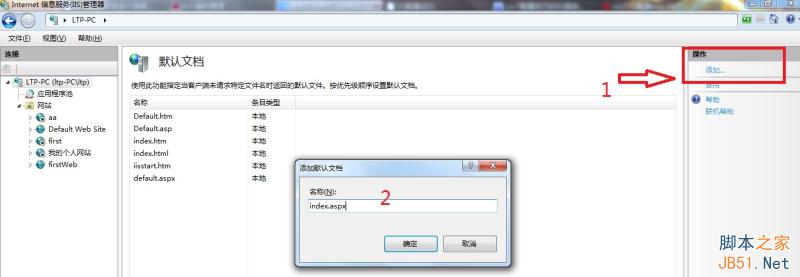 5、设置默认的开始页面,双击”默认文档“,点击“操作”下面的”添加“如下图所示: