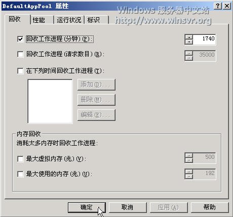 在下列时间回收工作进程:在指定的时间回收工作进程,默认禁用;如需启用,勾选后点击添加按钮添加回收的时间即可,使用24小时制定义回收的时间;