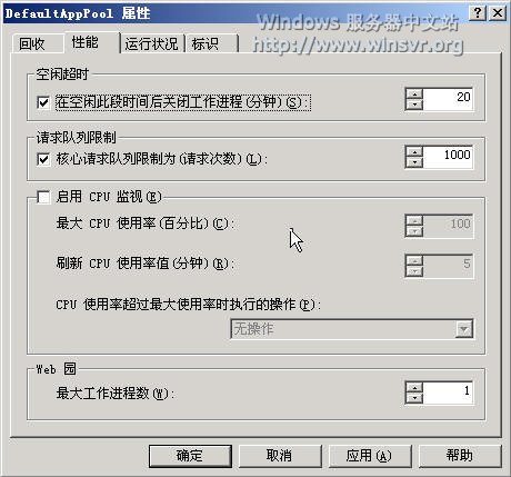 启用CPU监视:监视此应用程序池的CPU使用率,默认未启用;如果某个应用程序池占用的CPU利用率过多,那么可以通过配置此选项来限制此应用程序池;