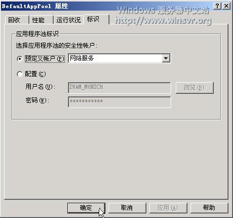 你可以配置工作进程运行在预定义的本地系统、本地服务或网络服务账户下,也可以配置为使用某个自定义的用户账户。建议使用默认的网络服务账户;不过如果为了更高的安全性,可以配置使用自定义的用户账户,不过建议你只是将此自定义用户加入到IIS_WPG用户组中,因此IIS_WPG用户组包含了可以启动和运行工作进程的最小权限。