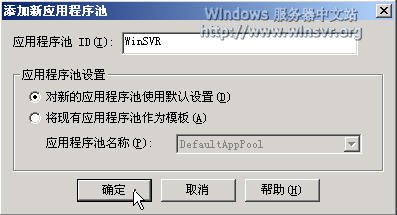然后在弹出的添加新应用程序池对话框,在应用程序池ID栏输入应用程序池名,然后选择使用默认设置还是继承现有的应用程序池设置,再点击确定即可;