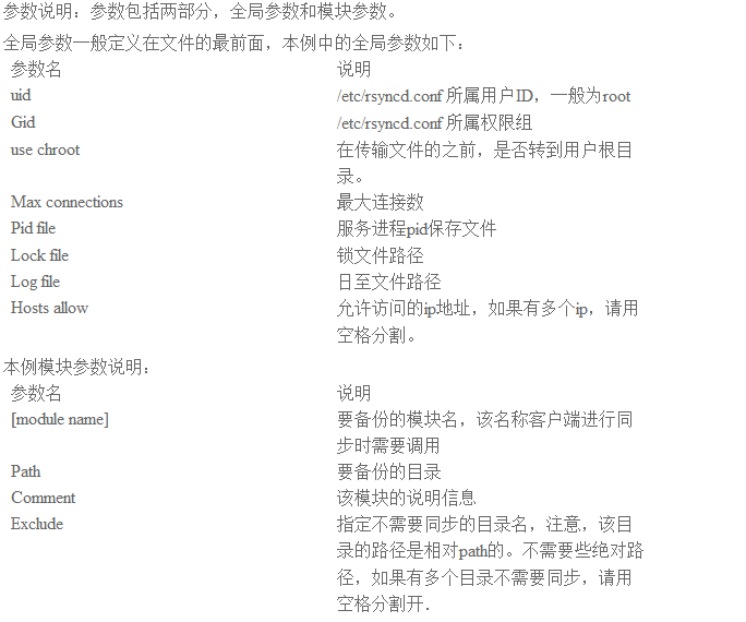 服务端的主要配置文件是 /etc/rsyncd.conf(该文件可能不存在,可以自己新建一个。) ,通过该文件可以配置全局访问的参数,需要备份的模块参数。以下面的配置为例: