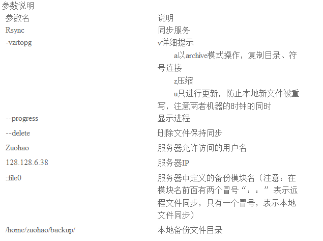 rsync -vzrtopg --progress --delete zuohao@128.128.6.38::file0 /home/zuohao/backup/