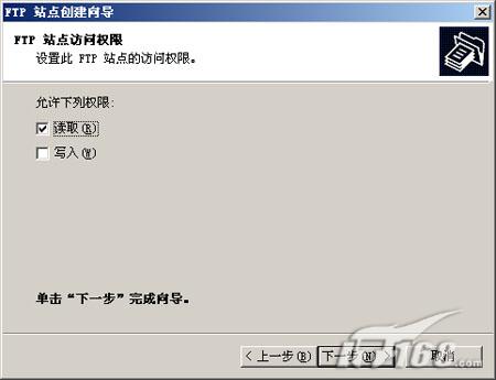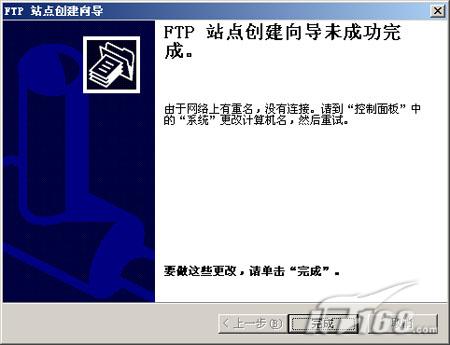 第十步:完成FTP站点的全部设置工作。当然如果建立过程中存在这样或那样问题的话会在设置向导的最后给出详细的提示信息,有效的帮助排除故障。(如下图)