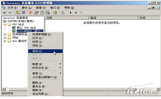 第十一步:我们再次返回到internet信息服务(IIS)管理器中在FTP站点下的“softe的FTP”上点鼠标右键选择启动来开启该FTP。(如下图)