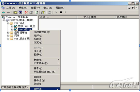 第一步:一般来讲要对已经建立好的FTP进行设置的话,都是通过FTP站点的“属性”来完成的。在该FTP站点上点鼠标右键选择“属性”。(如下图)