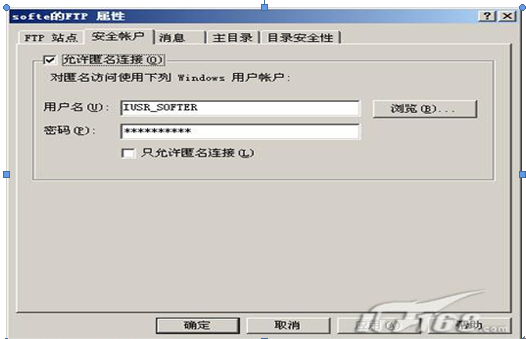 第二步:在FTP属性窗口中的“安全帐户”标签我们可以设置该FTP是否容许匿名登录,或者选择匿名登录使用的帐户。(如下图)