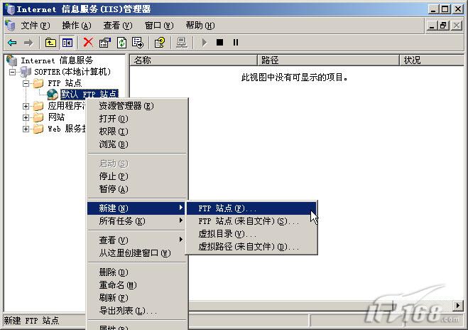 第三步:如果我们不想使用默认设置和默认路径的话可以进行修改,方法是在“默认FTP站点”上点鼠标右键选择“新建->FTP站点”。(如下图)