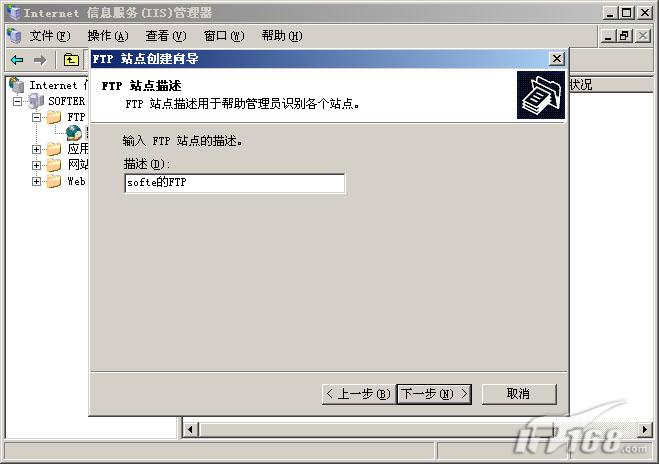 第五步:为FTP站点起一个名,这里设置为soft的FTP。(如下图)