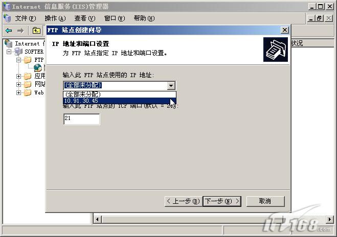 第六步:为此FTP站点设置一个可用的IP地址,选择实际的地址是可以的,如果拿不准的话还可以选择“全部未分配”,这样系统将会使用所有有效的IP地址做为FTP服务器的地址。同时FTP服务器对外开放服务的端口是多少也是在此进行设置的,默认情况下为21。(如下图)