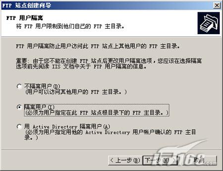 第七步:接下来是FTP用户隔离设置,这里的中文帮助信息写的非常明白,选择不隔离用户那么用户可以访问其他用户的FTP主目录,选择隔离用户则用户之间是无法互相访问目录资源的,为了安全起见需要隔离用户,应该选择第二项“隔离用户”。(如下图)