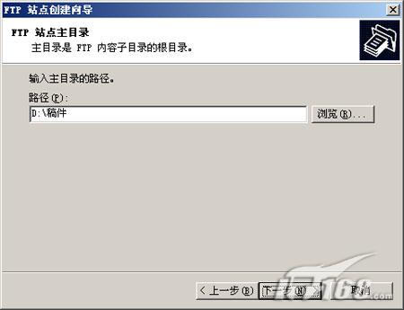 第八步:选择FTP站点的主目录,可以进行修改,默认为系统目录下的inetpub目录中的FTPROOT文件夹。通过右边的“浏览”按钮设置为其他目录,例如“D:\稿件”。(如下图)