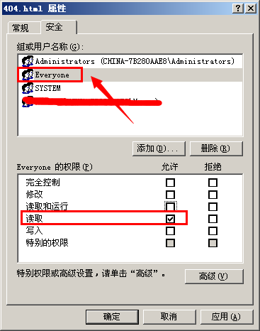 打开网页文件所在目录的自定义404错误页面,右键单击 属性 --> 安全 检查是否包含 Everyone 这个用户。如果没有,则 添加用户, 权限里只需勾选 可读即可,然后应用,确定。