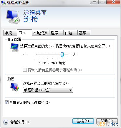 在“显示”选项卡中,显示配置调整窗口大小,一般是“全屏”