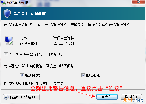 连接并且不向我发出警告:使用此选项,即使远程桌面连接无法验证远程计算机的身份,它仍然会连接。
