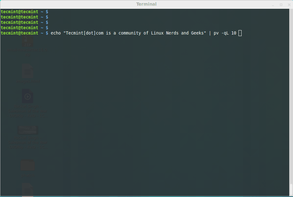 代码如下:$ echo "Tecmint[dot]com is a community of Linux Nerds and Geeks" | pv -qL 10