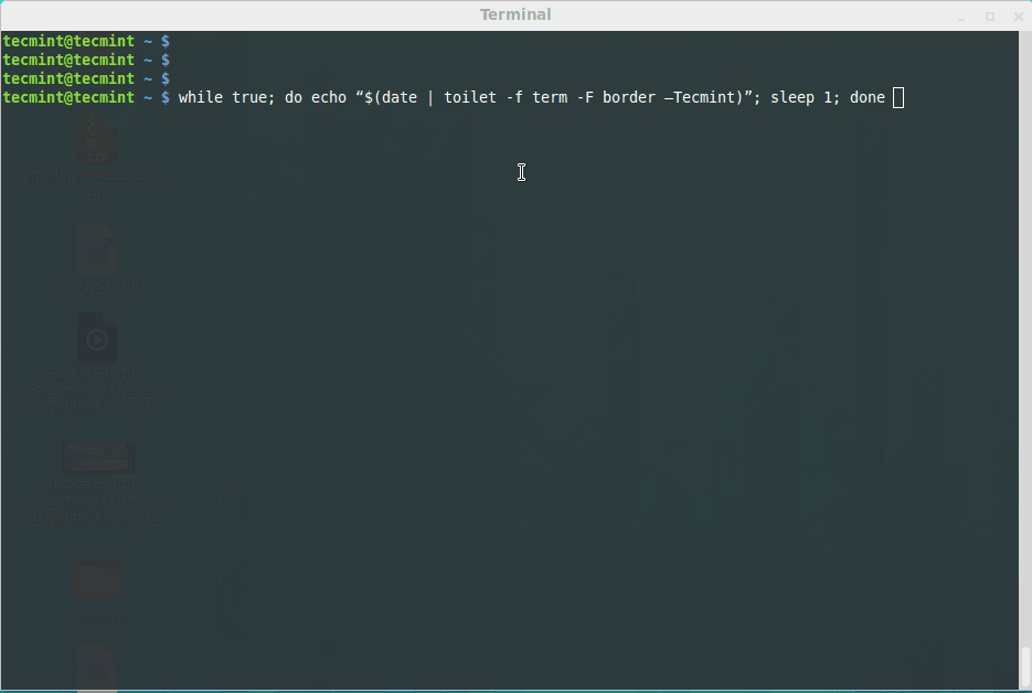 代码如下:$ while true; do echo “$(date | toilet -f term -F border –Tecmint)”; sleep 1; done