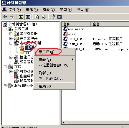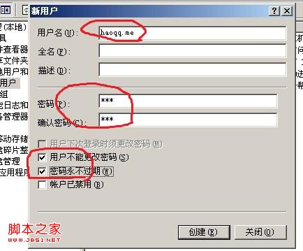 3.新建用户,用户名、密码、随便写,这些你得住,待会用得上的。用户不能更改密码和密码永不过期(勾上)