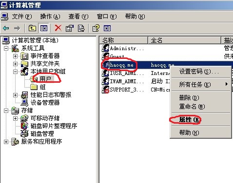 4.找到刚新建的用户,点击属性,接下来,我们要降低用户的权限