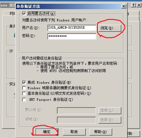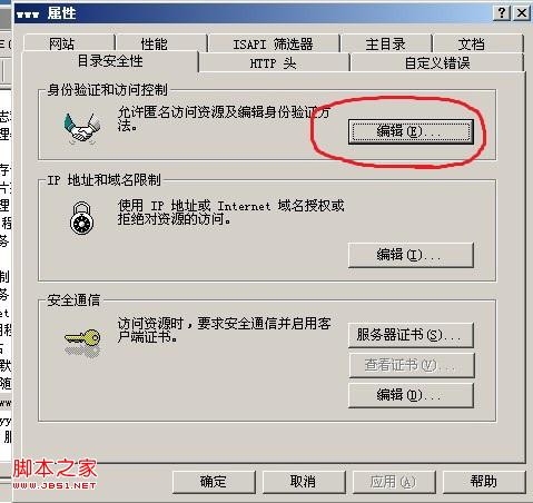 6.接下来,我们把刚建的帐号,应用到网站里, 打开IIS管理器,选择我们已经建的网站,属性-目录安全性-编辑身份验证和访问控制".
