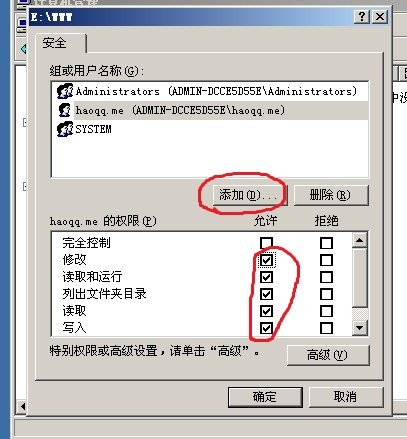 9.添加刚刚建起的用户,给予修改权限,安全项目里边,只保留Administrators ,SYSTEM和自建的IIS网站帐号,其它的通通删掉.