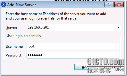 9、在服务器框中,输入要添加的服务器的 IP 地址或 DNS 名称。如果有多个XenServer服务器,可以通过在服务器框中输入用分号分隔的名称或 IP 地址,可以添加具有相同登录凭据的多个服务器。键入在 XenServer 安装期间设置的用户名(例如 root)和密码。 如果在 XenServer 环境中启用了 Active Directory (AD) 授权,可以在此处输入 AD 凭据。单击连接,将显示连接进度监视器,要取消连接,请单击取消。