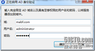 2、在启用AD身份验证的对话框中输入域名和域的管理员。