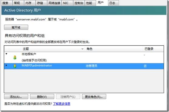 3、成功加入域后,会显示目前具有管理XenServer服务器的本地管理员root。要添加域中的管理员,单击“添加”按钮。