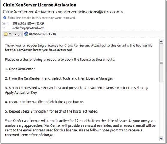 6、收到的包含激活密钥(文件扩展名为 .xslic)的电子邮件的内容为如何向XenServer激活密钥。申请出来的License可以被多台服务器使用。
