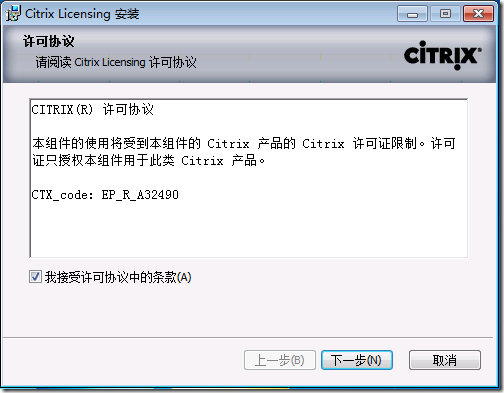 1、运行CTX_Licensing.msi安装程序,同意接受许可协议中的条款,单击下一步。