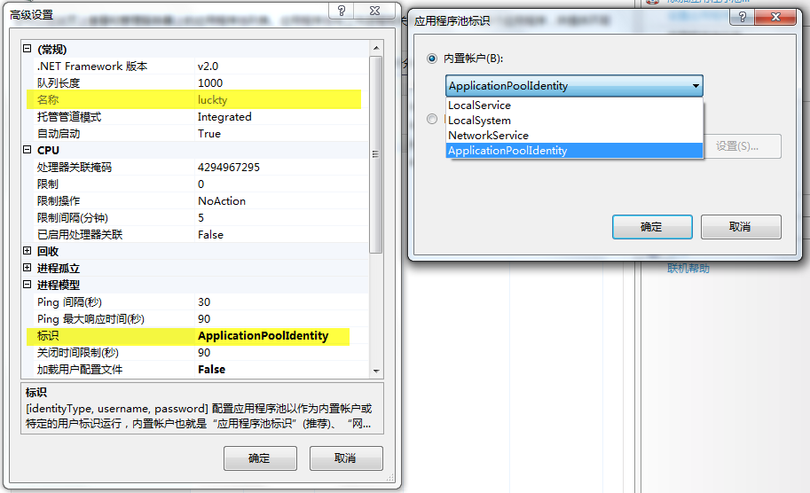 IIS7.5中(仅win7,win2008 SP2,win2008 R2支持),应用程序池的运行帐号,除了指定为LocalService,LocalSystem,NetWorkService这三种基本类型外,还新增了一种ApplicationPoolIdentify