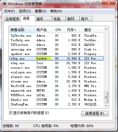 w3wp.exe即iis进程,上图中高亮部分表明该iis进程正在以帐号luckty运行(注意这里的luckty即为上图中的应用程序池名称)