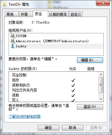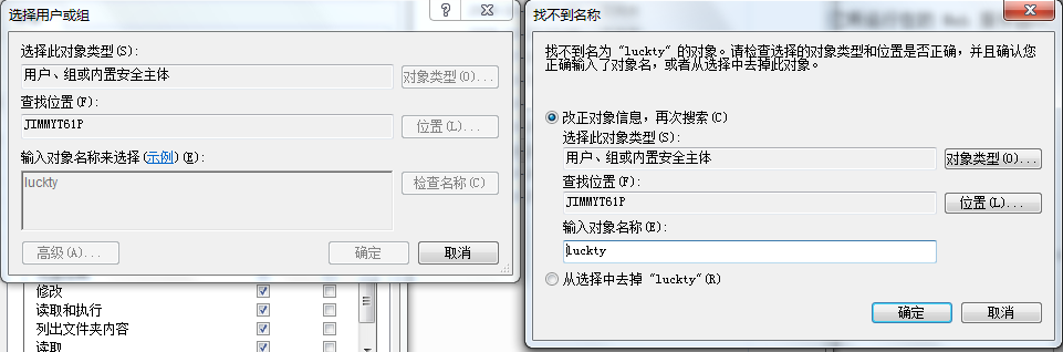 言归正传,要想让那一行测试代码正常运行,解决办法很简单,把虚拟帐号的权限加入文件夹安全权限中即可,但是问题来了:这个虚拟帐号我们是不可见的,如果你直接添加名为luckty的用户到文件夹安全帐号里,根本通不过(提示找不到luckty用户),说明这个虚拟帐号名称并不是"luckty"