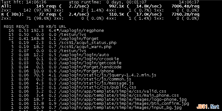 apachetop也可以实时监测nginx日志,不过nginx访问日志格式必须是通用或联合日志格式,否则有些信息统计不到。