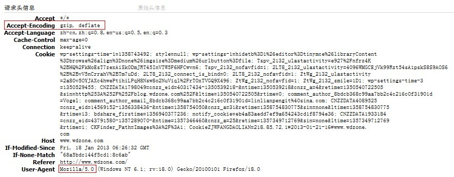 通过查看HTTP头,我们可以快速判断使用的客户端浏览器是否支持接受gzip压缩。