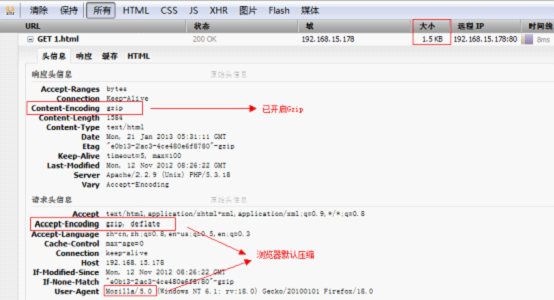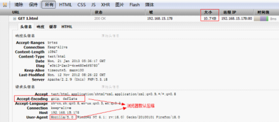 现在浏览器本身也自动Gzip压缩功能,支持Accept-Encoding: gzip,deflate ,这里我在firefox浏览器下测试。
