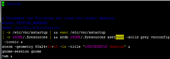!/bin/sh Uncomment the following two lines for normal desktop: unset SESSION_MANAGER exec /etc/X11/xinit/xinitrc [ -x /etc/vnc/xstartup ] && exec /etc/vnc/xstartup [ -r $HOME/.Xresources ] && xrdb $HOME/.Xresources xsetroot -solid grey #vncconfig -iconic & xterm -geometry 80x24+10+10 -ls -title "$VNCDESKTOP Desktop" & twm & gnome-session &