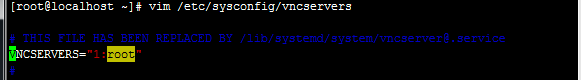 vim /etc/sysconfig/vncservers 修改最后一行 VNCSERVERS="1:root"