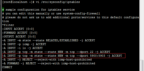 vi /etc/sysconfig/iptables 注释:可以复制22端口一行,黏贴修改即可,重新启动防火墙服务 -A INPUT -m state --state NEW -m tcp -p tcp --dport 5900:5903 -j ACCEPT 5900端口是远程控制软件VNC的默认服务端口