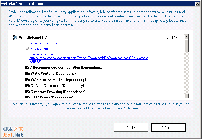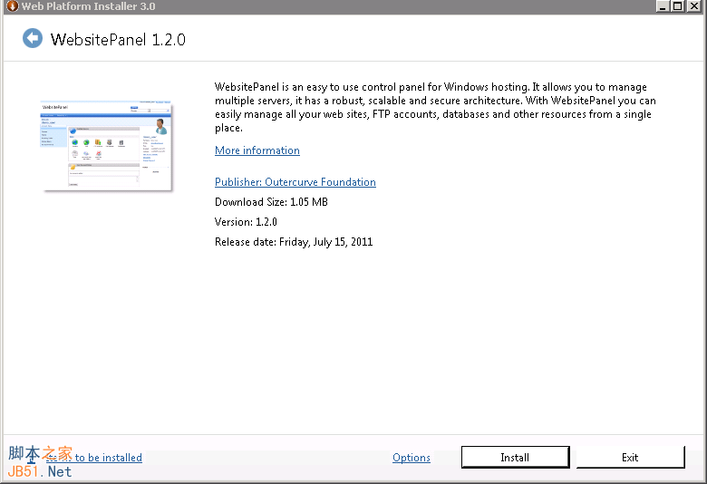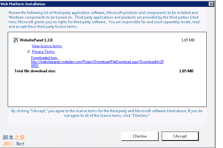 访问官网http://www.microsoft.com/web/gallery/install.aspx?appid=websitepanel下载WebsitePanel安装程序,在这个页面点击Install Now后下载websitepanel.exe安装程序。