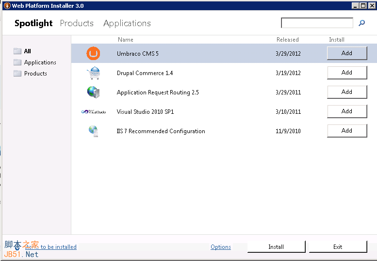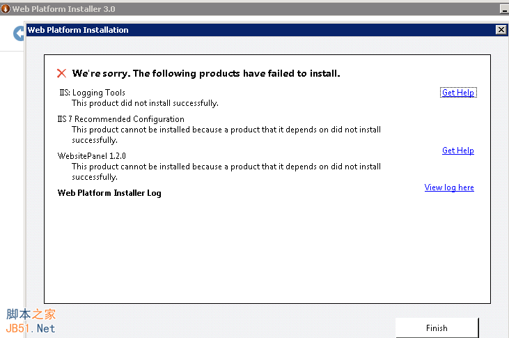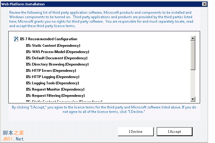 图6可以看到很多IIS组件加载失败了,原因是IIS上我没加载,于是在IIS中重新加载了下相应的组件,之后点击IIS 7 Recommended Configuration后的Add然后点击Install看到: