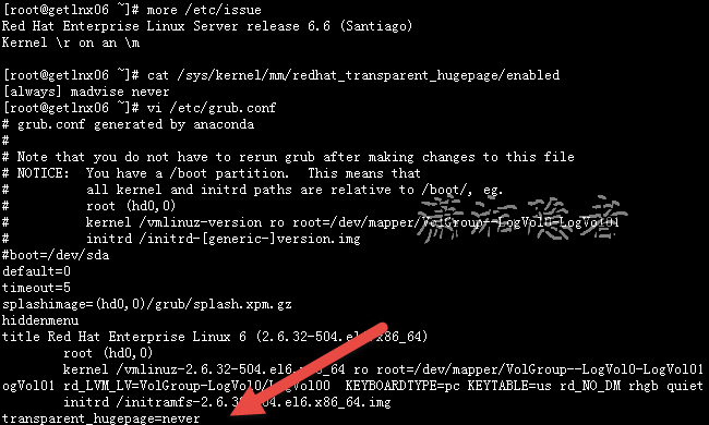 [root@getlnx06 ~]# more /etc/issue Red Hat Enterprise Linux Server release 6.6 (Santiago) Kernel \r on an \m [root@getlnx06 ~]# cat /sys/kernel/mm/redhat_transparent_hugepage/enabled [always] madvise never