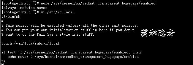 [root@getlnx06 ~]# vi /etc/rc.local #!/bin/sh # # This script will be executed *after* all the other init scripts. # You can put your own initialization stuff in here if you don't # want to do the full Sys V style init stuff. touch /var/lock/subsys/local if test -f /sys/kernel/mm/redhat_transparent_hugepage/enabled; then echo never > /sys/kernel/mm/redhat_transparent_hugepage/enabled fi